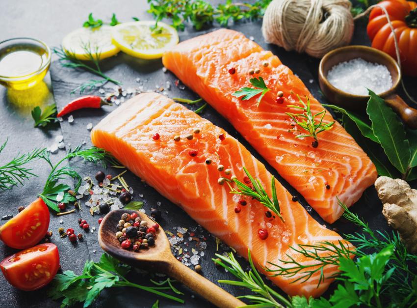 · Next heat the coconut oil in a frying pan and place the salmon fillets skin side down.