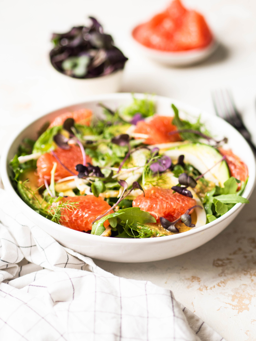 Combine the fennel, avocado, grapefruits and greens in a large salad bowl.