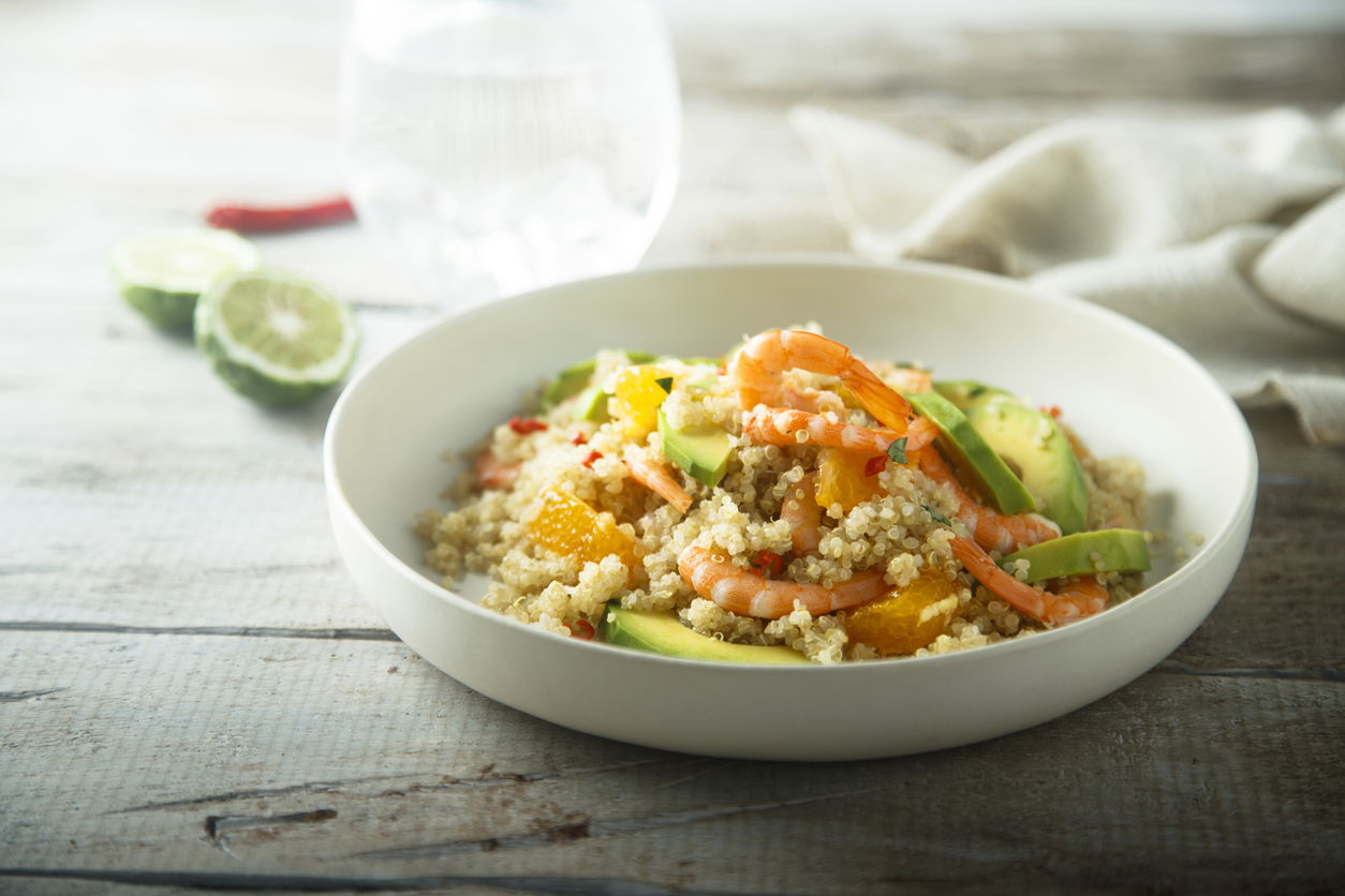 Spoon the quinoa mixture into a serving bowl, then top with the prawns.