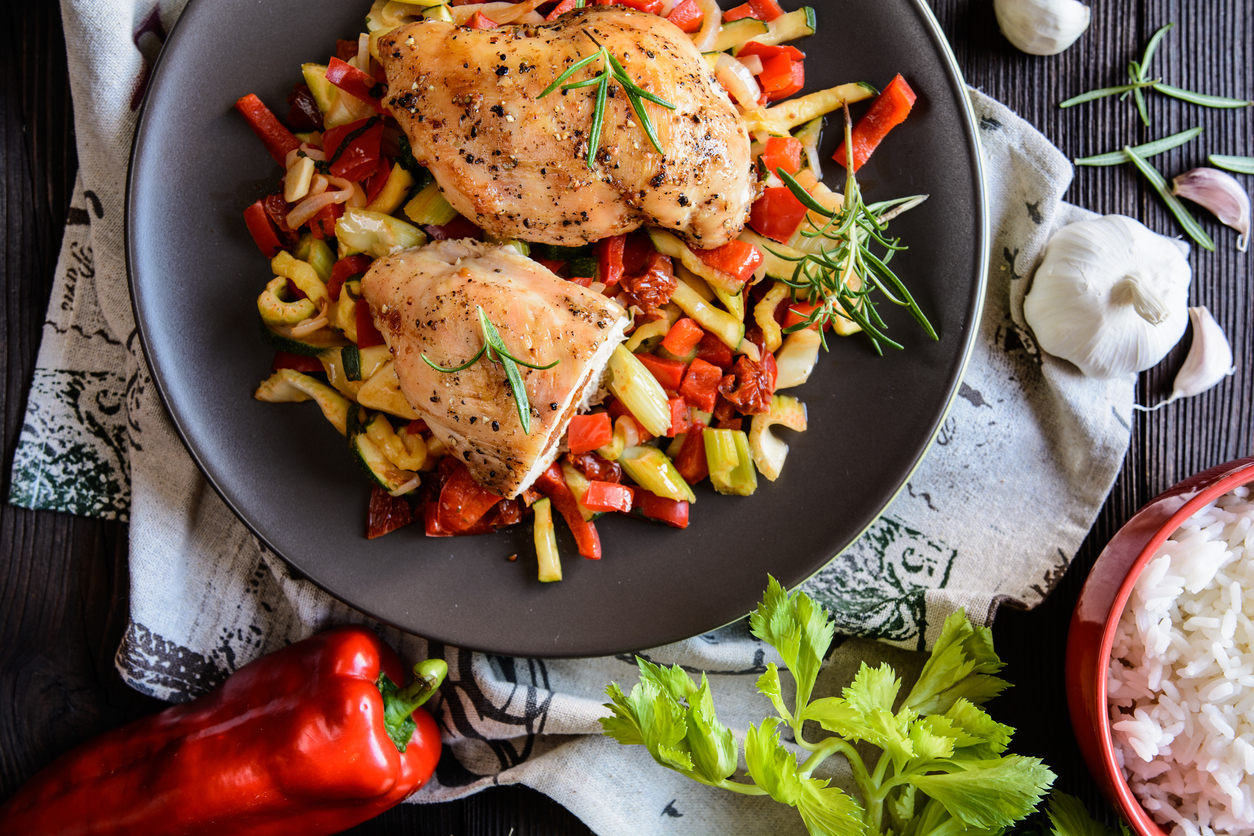 - Add the chicken and its marinade to the pan, mix together well and cook in the oven for 25 minutes