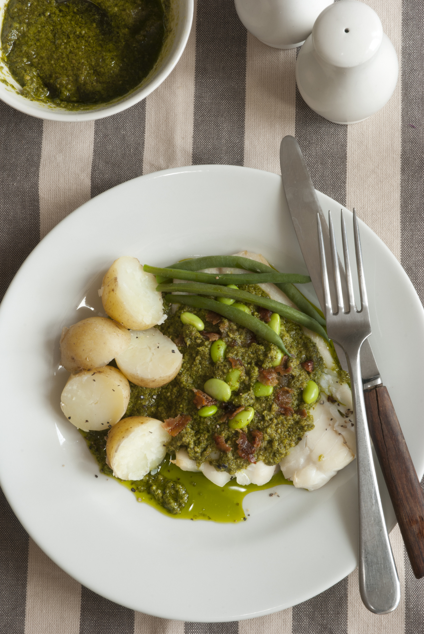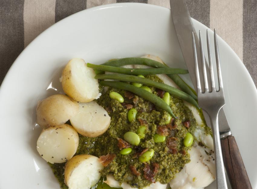 Pan-fried gurnard with broad bean, spinach and mint stew