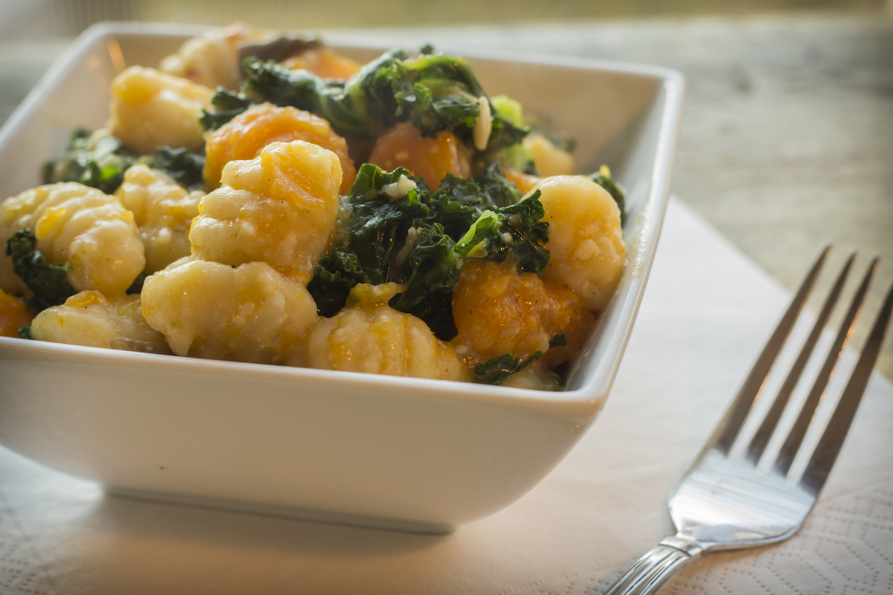 When the squash is cooked take the pan off the heat and blend to form a thick sauce. If you don’t have a hand blender or liquidiser you can mash the squash with a potato masher. Taste the sauce and add a grating of nutmeg and season with salt and pepper to taste.