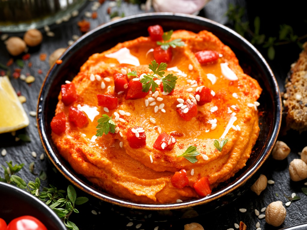 Sometimes plain old hummus, even if it is totally delicious and home made doesn’t cut it so I’ve been experimenting with a few new flavours. Here’s my newest favourite.