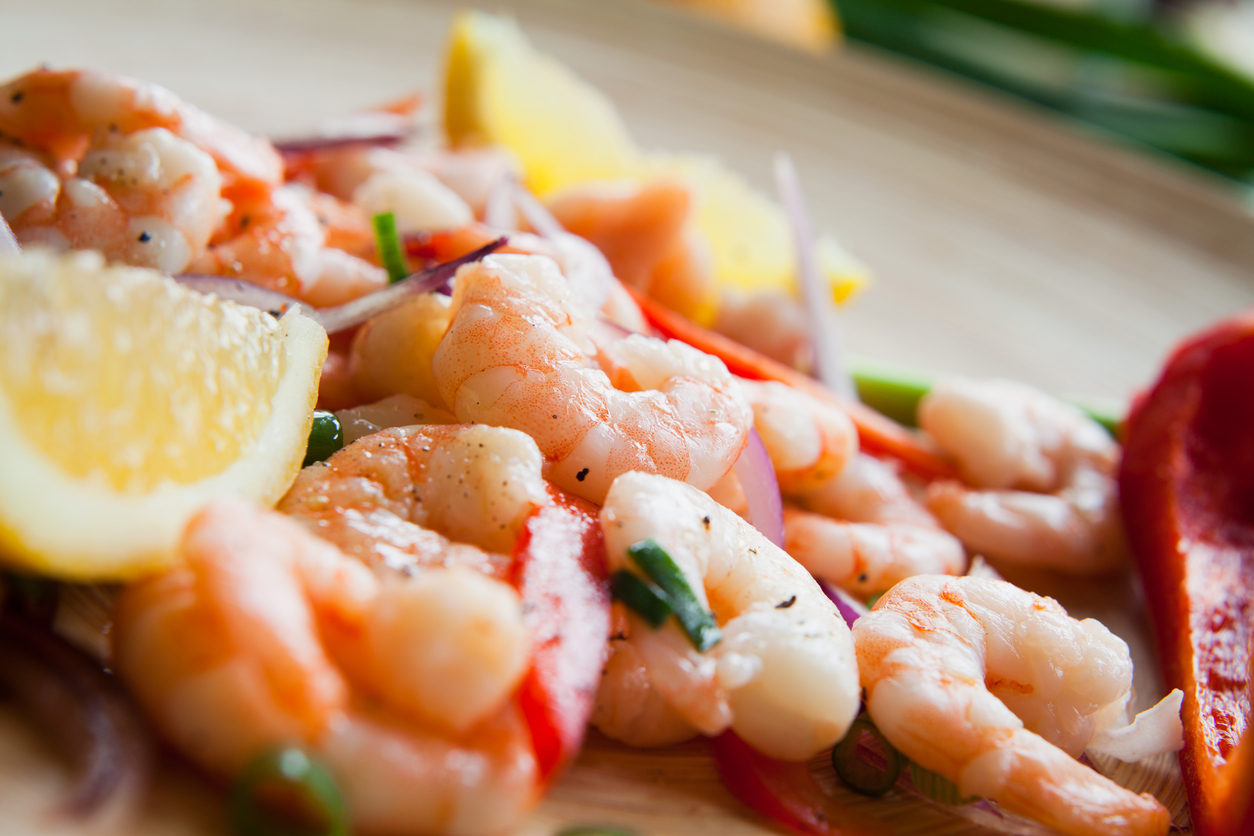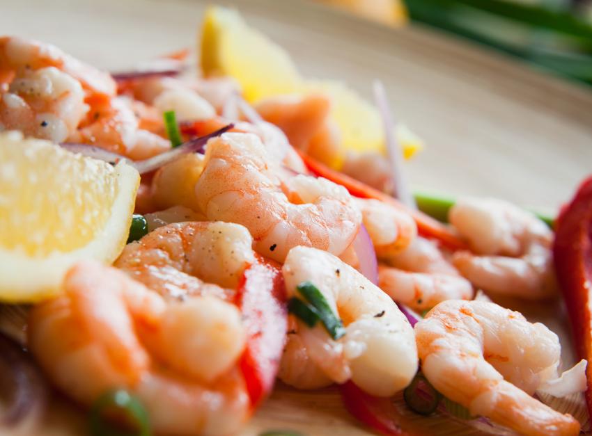Transfer the baked cauliflower and sweet potato to a serving dish, fold in the prawns and dress it with the oil from the baking tray. Serve immediately on warmed plates.